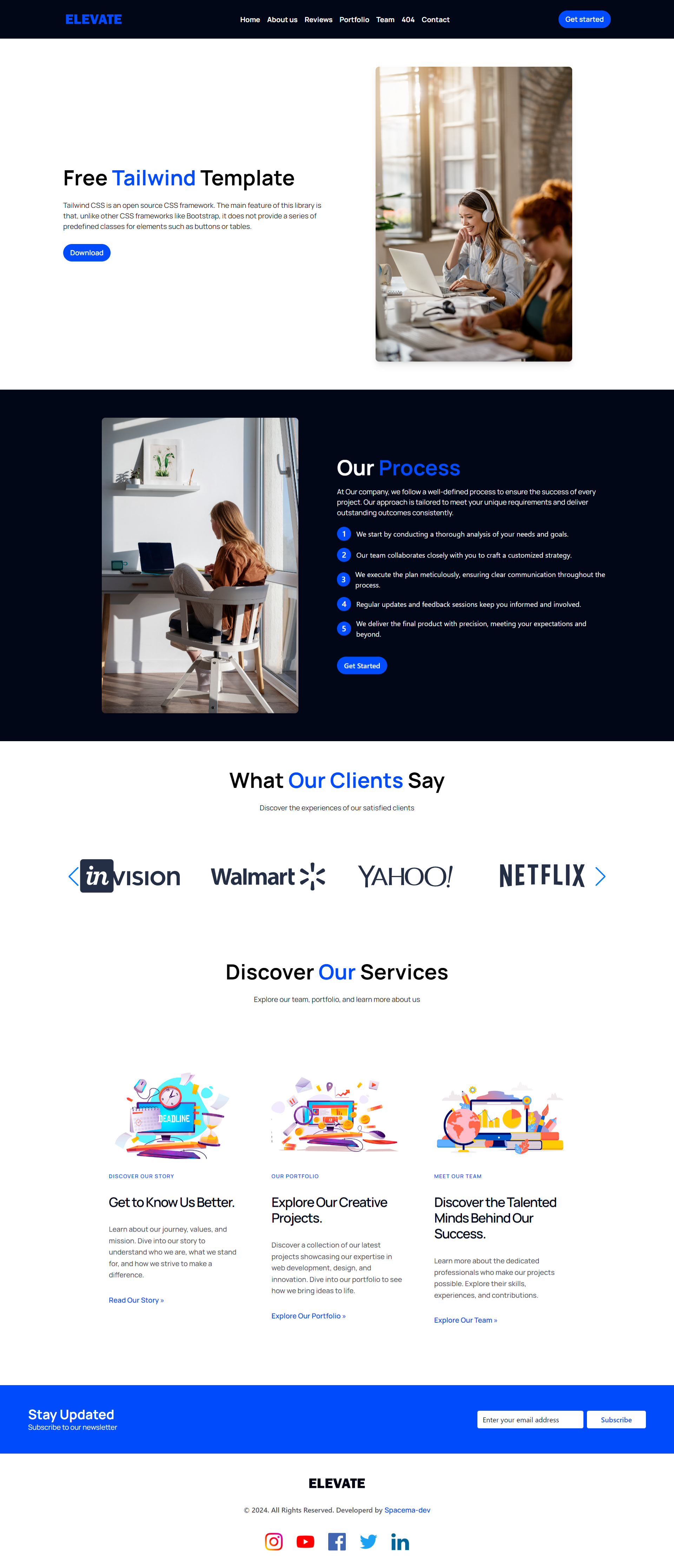 Elevate is a free, modern, and responsive business website template built with Tailwind CSS.